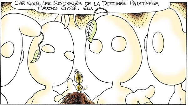 … pas que Patateman, d’ailleurs. Les Seigneurs de la Destinée patatifère sont là pour élever nos pensées et nos âmes vers des lendemains qui sentent bon la tartiflette. Ce sont Eux qui ont choisi Patateman pour la Noble Destinée qui est la sienne, et d’ailleurs, Patateman a été créé à leur image : une bande de joyeux glandeurs qui n’en foutent pas une ramée de la journée.