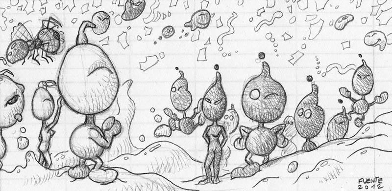 En tout cas, Patatras se marre à n’en plus finir, et à force de tapoter inlassablement les Patates sombres, se retrouve à la tête d’une petite armada de patates roses qui gazouillent bruyamment tout en sautant dans tous les sens. Ce qui cesse d’être rigolo au bout de 3 ou 4 secondes. Bref, bien que bonne pâte, les Patates sombres commencent à en avoir un peu marre de leurs homologues Terriens et les foutent dehors, clones roses inclus.