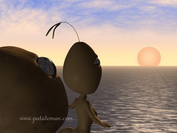 Bref, tel un prélude à un Requiem de Mozart, le soleil se couche sur les vagues frangées d’écume de l’océan Atlantique. Patateman squatte, comme d’habitude, la proue du paquebot, l’air maussade, avec en arrière-plan sonore, les mouettes qui piaillent en un grotesque opéra psittacidé. Puis, on aperçoit derrière lui, arriver Patategirl, pour la scène mythique.