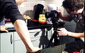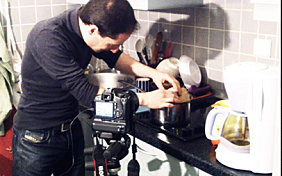 Toujours pour le final donc, on cale le Patateman avec du scotch, et le fil de fer est planté directement dans la pomme de terre servant de monture à la peluche. Je déplaçais donc tous les légumes, image par image, en me planquant derrière le comptoir à chaque prise.