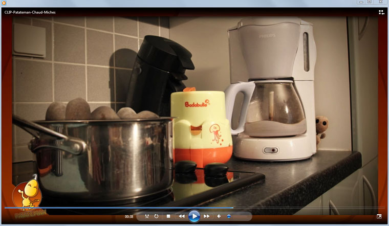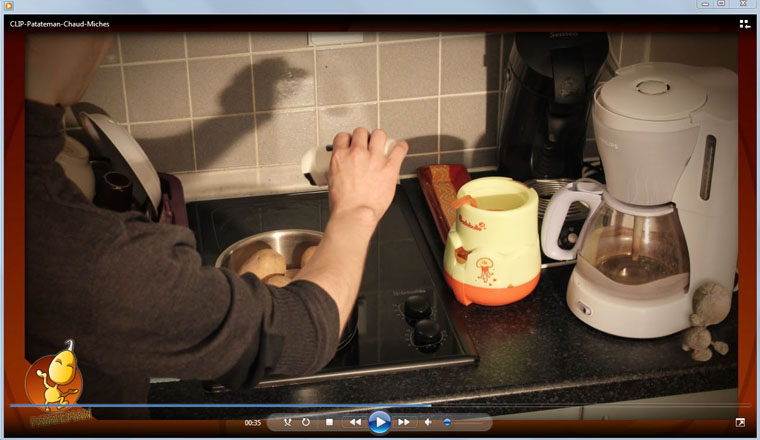 Au moment où je sale les infortunées patates – les scènes dans lesquelles j’apparais sont tournées en image par image également, c’est curieux de bouger en saccadé – vous repérez le Patateman qui court se planquer derrière la cafetière ?