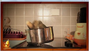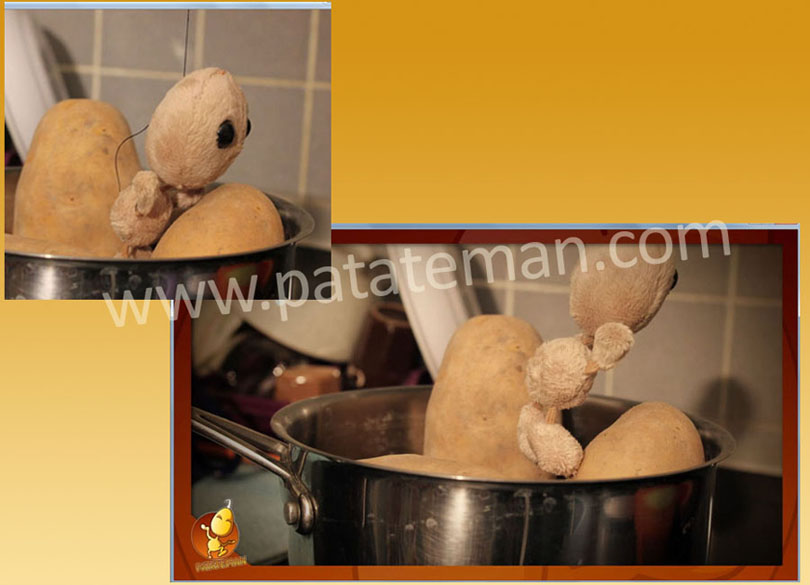 Et c’est parti : le Patateman et les pommes de terre sont animées image par image dans la casserole – certaines patates servant à caler la peluche. Et comme il s’agissait de prises de vue réelle, il ne fallait pas que j’oublie d’animer toutes les patates en même temps que la star renforcée de fils de fer.