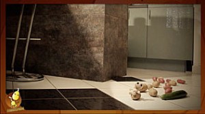 Ensuite, on voit le héros qui s’apprête à sauver ses confrères. La peluche comme les pommes de terre sont rajoutés sur une photo fixe (pas de zoom ni déplacement de la caméra). Vous noterez que Sébastien a ajouté une ombre à la peluche, et un très léger reflet sur la surface du comptoir.