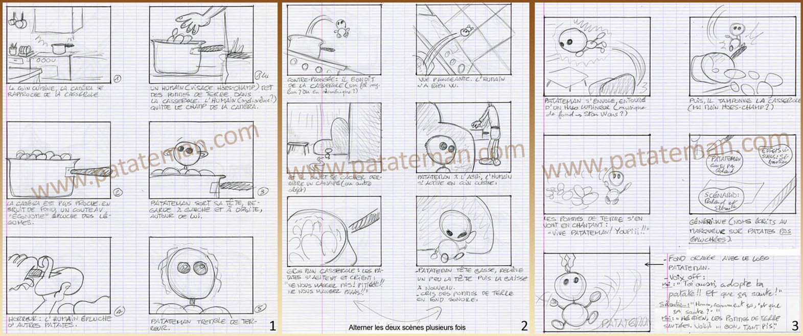 Puis, un petit jus de cerveau (un story-board, quoi) est ensuite préparé, ce qui donne un premier aperçu de l’historiette ; pour des soucis de rythme, on l’a évidemment modifié avec Sébastien, vous pouvez comparer avec le clip final.