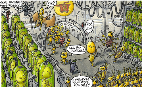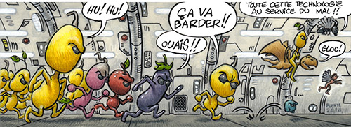 En l’occurence, les illustrations ci-dessous nous montrent Patateman et ses amis végétaux qui envahissent l’engin infernal des Doryphores, où une assez mauvaise surprise les attend…