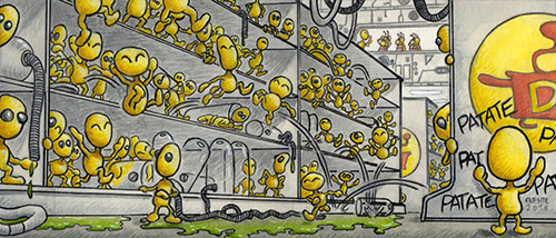 Les prochaines illustrations que j’entame montreront Tomateman qui, de son côté, attaque les Doryphores par voie aérienne avec une armada d’Aigles munis de Pop-Corns rigolards.