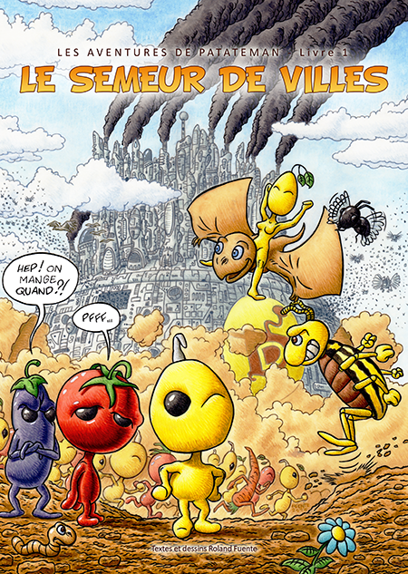 Alors, pour celui ou celle qui arrive pour la première fois sur ce site, guidé(e) par la chance (ou par la Destinée patatifère), un petit résumé du « Semeur de Villes » : Patateman est un petit patatoïde, malicieux et bon vivant, qui se la coule douce au Royaume des Légumes, avec sa copine Patategirl (la patate la plus sexy du monde), enthousiaste et aux envolées lyriques, Auberginos le pique-assiette qui ne pense qu’à se goinfrer, Icare le Ptérodactyle que Patategirl a adopté lors d’un voyage touristique dans le temps, ainsi que la Fourmi volante qui parle, originaire de l’an 1 000 000.
