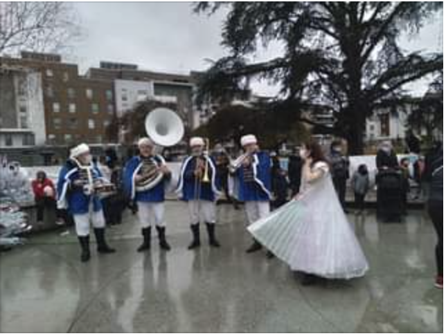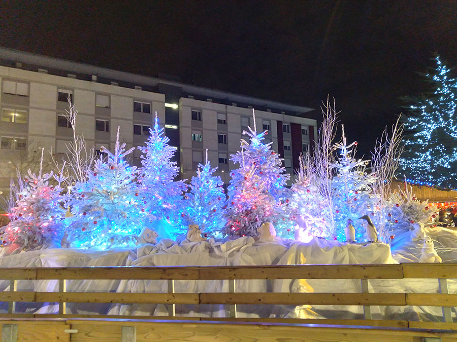 J’avais plusieurs photos et vidéos, mais presque tout est perdu (effacés mystérieusement de mon dossier Téléchargements (??)), et j’avais tout supprimé sur Google Drive avant que tout soit au chaud dans l’iMac… Je ne pourrais donc que vous expliquer brièvement qu’il y a eu des danseurs et danseuses sur échasses, tout de blanc vêtus, avec un tissu comportant des loupiotes. L’une d’elles tenait une sorte de fumigène qui en cramant, répandant alentour de la fausse neige, du plus bel effet. Un orchestre, tout de bleu vêtu, précédait cette procession féérique.