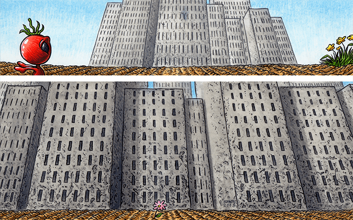 Mais Tomateman a raison… des bruits inquiétants l’empêchent de dormir, et bientôt, il découvre d’immondes bâtiments gris qui poussent comme des champignons. Rapidement, le Royaume des Légumes se retrouve encerclé, les Animaux se sauvent, et des patatoïdes hors du Royaume des Légumes disparaissent depuis des semaines… tous sont menacés par les Doryphores.
