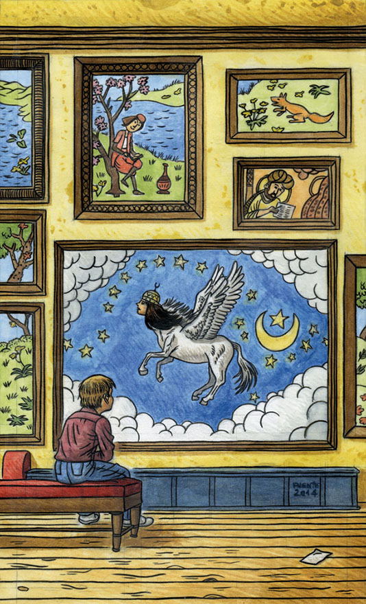 Le héros, François, dans une salle du Louvre dédiée à l’islam (2014), gouache, format A5 (environ).