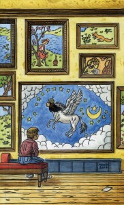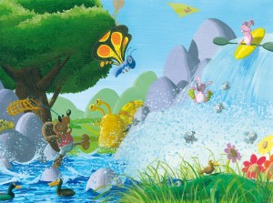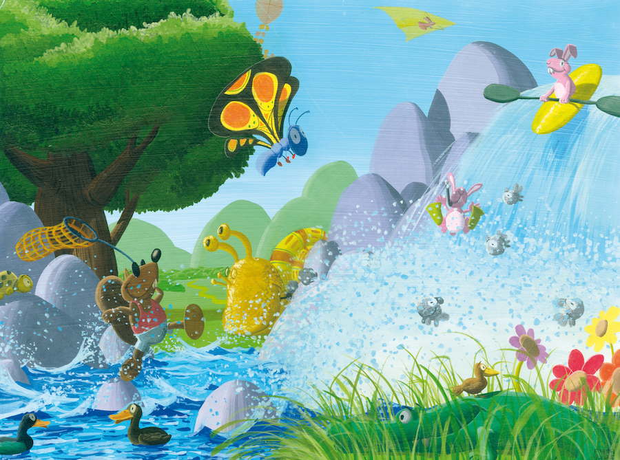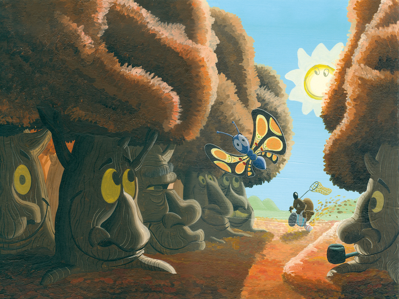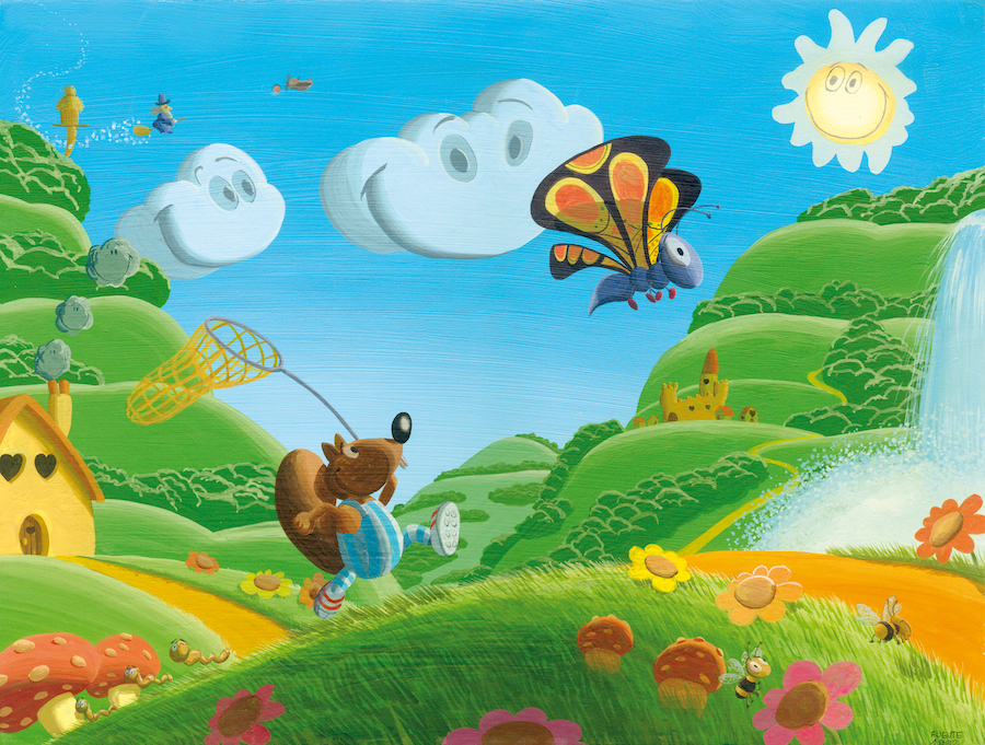 Les 4 illustrations ci-dessous datent de l’époque où j’étais étudiant à l’EDTA Sornas, école de graphisme et d’illustration. En ces temps lointains, de 1990 à 1993, il s’agissait, en deuxième année, de concevoir un ludique projet de calendrier pour enfants intitulé Papilio, (jamais commercialisé), dans lequel un Écureuil poursuivait un Papillon tout au long de l’année. Avec un filet trop petit, d’ailleurs.