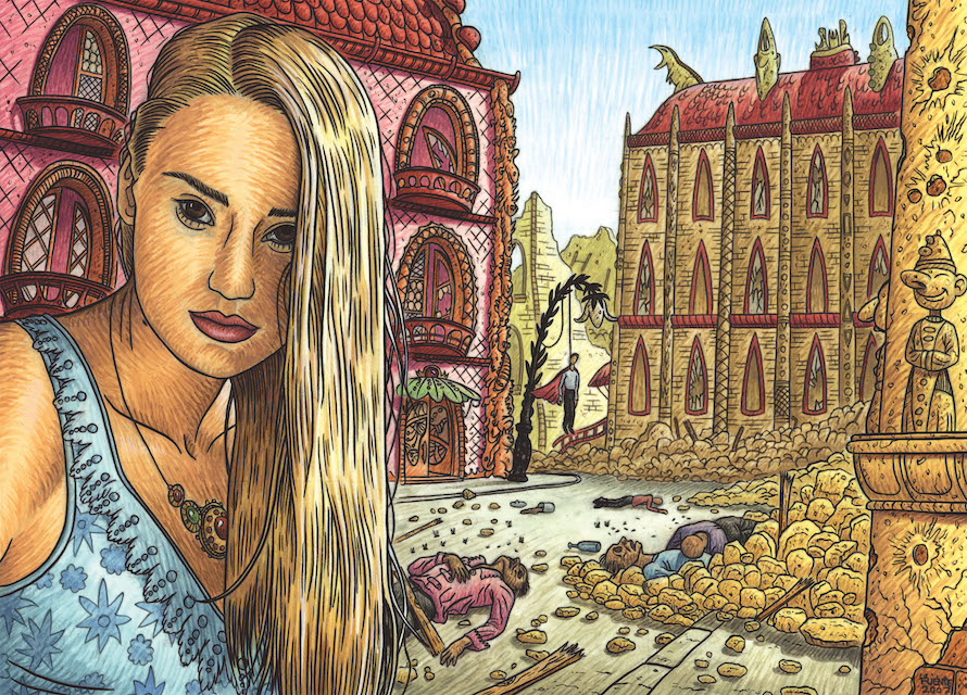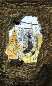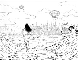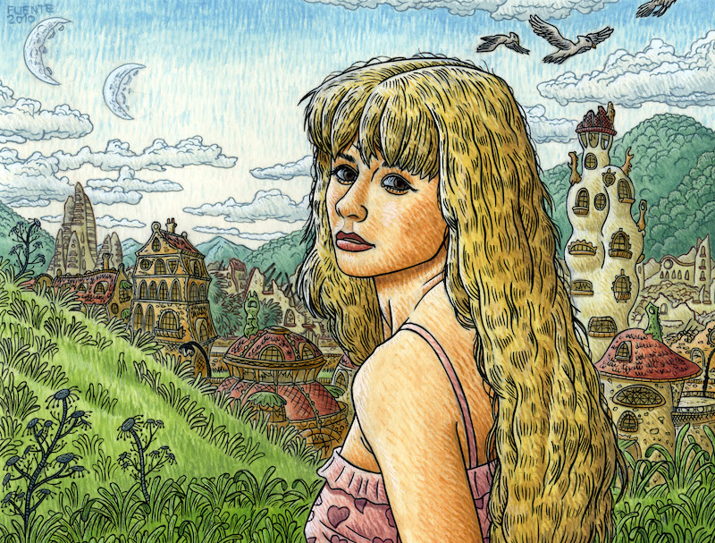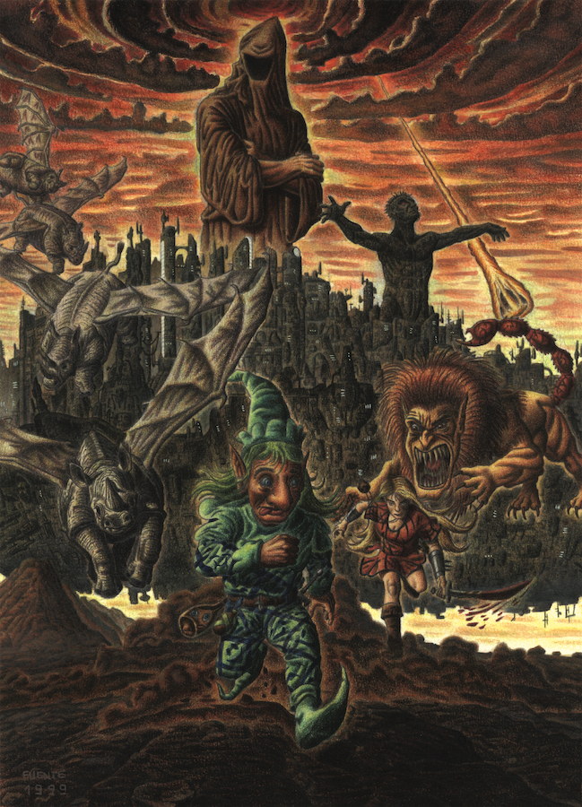 Locura, Royaume de Folie, illustration pour un roman de Jacques Fuentealba (1999), crayons couleurs sur lavis d’encre et quelques rehauts d’acrylique, 18,7×26 cm. Je ne vous raconte pas le nombre d’heures de travail ^^…