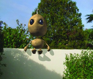 Patateman dans le monde réel, assis sur le mur du jardin (2005 ?), photo réelle évidemment, puis montage final dans Lightwave. La photo étant une texture appliquée en mode fond d’écran sur un objet blanc (et l’on voit donc l’ombre portée de Patateman sur le mur).