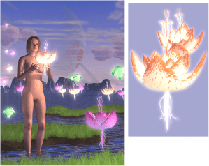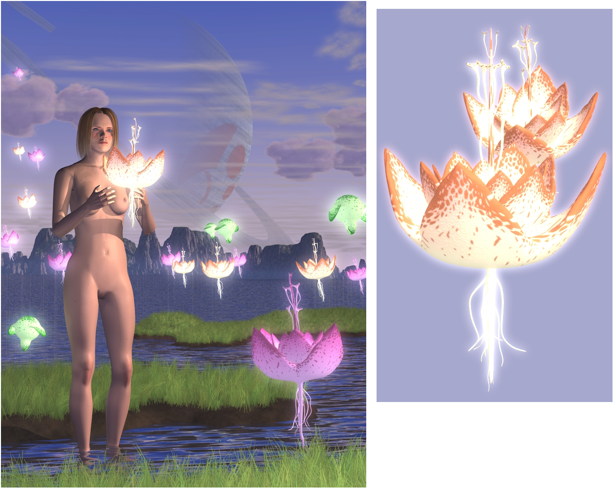 Jeune femme blonde et Nénuphars volants (2007), logiciel Lightwave. On devine une Lune artificielle en arrière-plan.