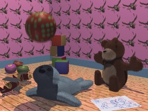 Jouets dans une chambre d’enfant (200?), logiciel Lightwave. Le filtre de l’époque, SasLite, simule la fourrure des peluches.