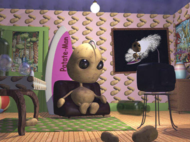 Première illustration de Patateman qui bulle devant la télé (2004), logiciel Lightwave.