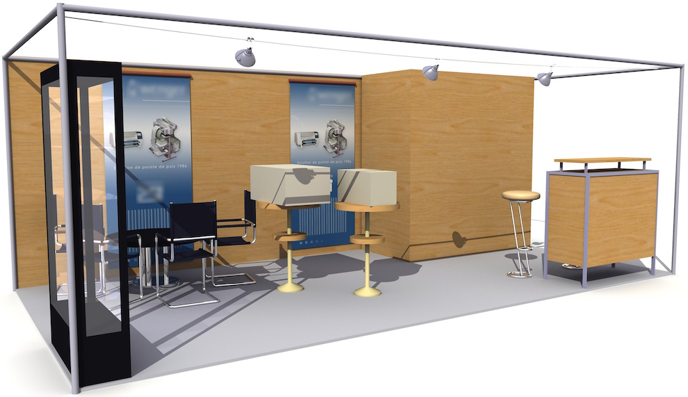 Maquette 3D pour un stand professionnel (2007 ?), logiciel Lightwave. Une autre commande de Créatyx.