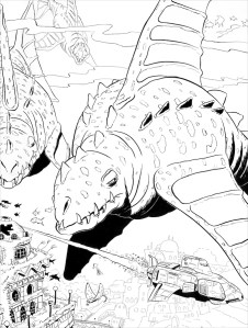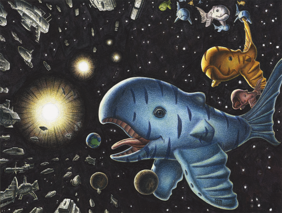 Gobeurs de Mondes (1998), crayons couleurs sur lavis d’encre, 24×18 cm. D’une longueur moyenne de 150 000 kilomètres à l’âge adulte, si ces créatures, sympathiques au demeurant, se pointent un de ces jours dans notre système solaire… on aura vraiment du souci à se faire !
