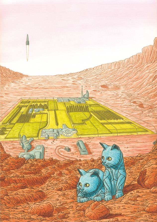 Chats bleus sur Mars – des robots – (2005), gouache, 30×40 cm.