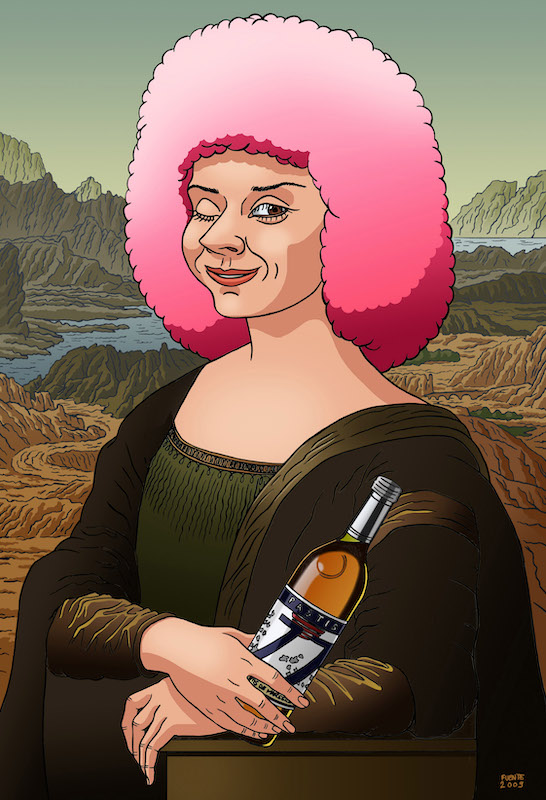 Joconde au Pastis (2009), petite caricature pour un cadeau d’anniversaire. Je ne connais pas la destinataire, d’ailleurs. Gouache noire sur papier, puis colorisation Photoshop, 30×40 cm.