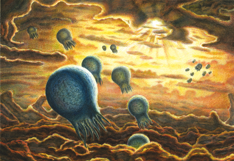 Sphéroïdes (1997), crayons couleurs sur lavis d’encre, 21×15 cm. Créatures volantes, véritables ballons vivants d’un diamètre de 15 à 20 kilomètres qui résident dans une vaste planète gazeuse, et se nourrissent de plancton aérien.