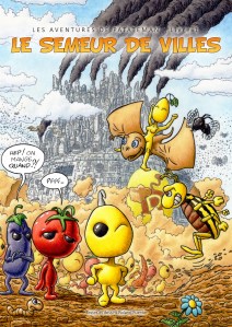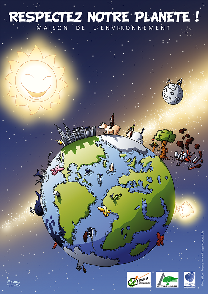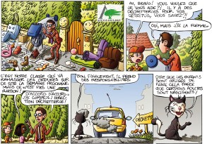 Couverture d’un mini-album BD réalisé par les adhérents du Club de loisirs (disparu depuis) en partenariat avec la Maison de l’Environnement d’Aulnay-sous-Bois (2013), dessin sur papier au format A4, scan puis couleurs Flash et Photoshop.