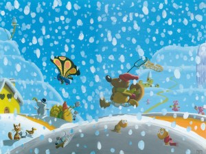 Hiver (1992), gouache, 30×40 cm. Et retour au paysage du début de la série, la neige en plus.