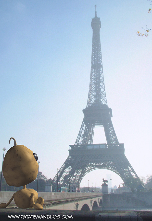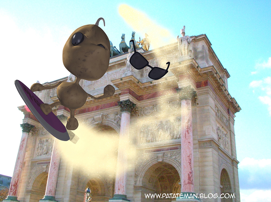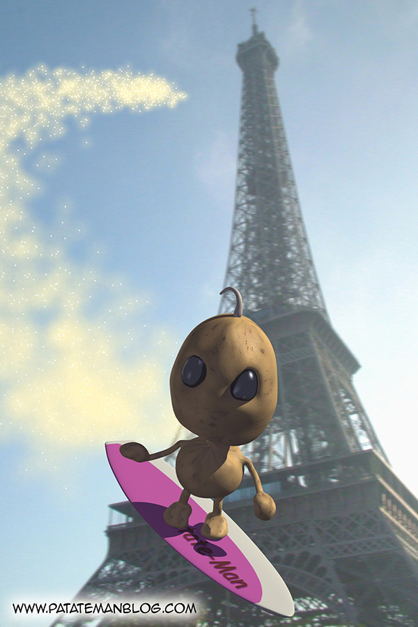 Patateman dans le monde réel, surfant devant la Tour Eiffel ^^ (2005 ?), Lightwave.